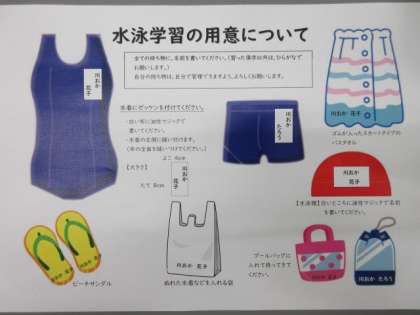 先週末に配ったきらめきの裏面,「水泳学習の用意について」を見て,ご準備をお願いします。