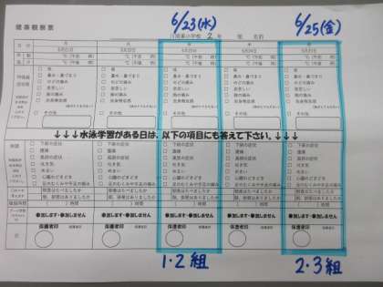 また,毎日の健康観察票は,水泳学習がある日は下段の記入と保護者印が必要ですので,記入漏れのないようにお願いします。