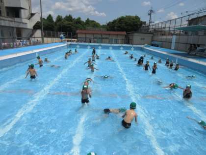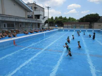 今日の3・4時間目の体育の授業で,1組と2組の水泳学習をしました。昨年度はなかったので,2年生にとっては初めてのプールでの学習です。