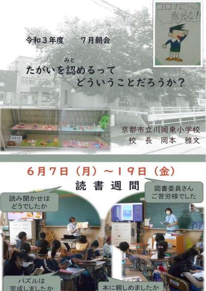 7月の朝会では,6年生に体育館に集合してもらいました。1〜5年生は各クラスでリモート参加。少しずつ日常が戻ってくればうれしいことです。6年生の朝会での姿,立派でした。6年生として自覚をもって話を聞く雰囲気を作ってくれていました。時折,6年生に反応してもらいながら話をいたしました。