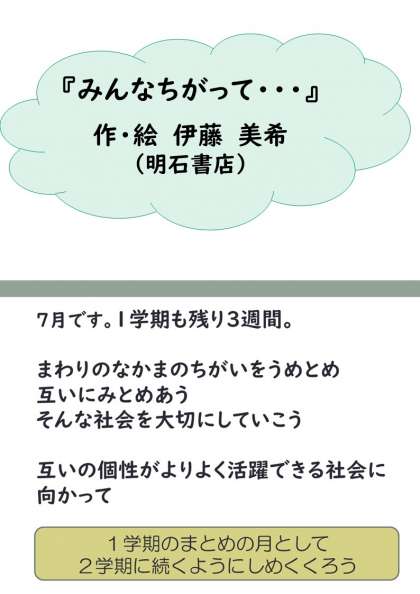 今回は,6月が読書週間でもあったので,1冊の本を紹介させていただきました。『みんなちがって・・・』という絵本です。それぞれの個性をどうとらえるのか,互いを認めるってどういうことなのか,そんなことを投げかけさせていただきました。男女共同参画創作コンクールで賞された絵本です。小学校3年生が作者で,「みんなちがって すばらしい」「みんないいとこ いっぱいもってるよ」としめくくられています。