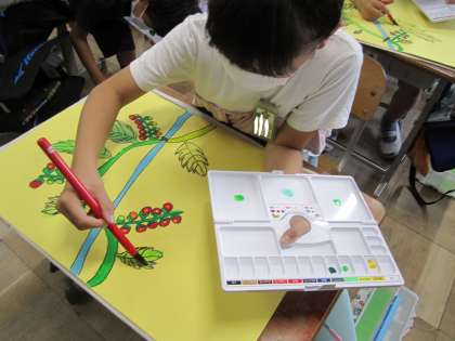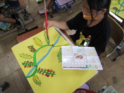 綿棒を使ってミニトマトなどの細かいところをぬったり,絵の具で葉をぬったりして仕上げていきます。