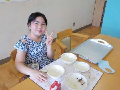 頭の中に,いわしくんの「命」を思い浮かべている子ども達。苦い顔をしながらも一生懸命に口に運び,みんなで見事完食することができました。