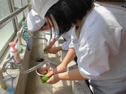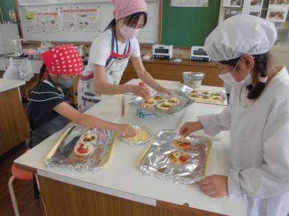 なかよし学級の畑で育てているピーマンとミニトマトを朝一番に収穫し,みんなでピザ作りに挑戦しました。手を切らないように猫の手にして慎重に野菜を切っていました。高学年の友達が切り方を下学年の友達に教えてくれる姿もありました。餃子の皮にピザソースを塗って切った野菜,とろけるチーズをのせてオーブンで焼きます。家庭科室がいいにおいでいっぱいになり「おいしそう!」と歓声が上がっていました。出来上がり,みんなで「いただきます!」。苦手なピーマンもみんなで作るとおいしく食べることができました。笑顔でいっぱいになりました。野菜を育てるためにお世話になった先生にもピザをプレゼントしました。「おいしかった。ありがとう。」と言われてとても嬉しそうななかよしのみんなでした。