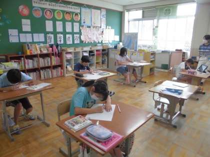 図画工作では,お話の絵に挑戦しています。「カメレオンのかきごおりや」というお話でカメレオンがいろいろな動物に素敵なかき氷をあげると気持ちがすっきりして嬉しい気持ちになっていくというストーリーです。パワーアップタイムにもこの絵本を楽しそうに役割読みしています。今日は自分の好きなかき氷をイメージして下絵を描き,タンポでとんとんとスタンプしてシャリシャリするかき氷を表現することができました。