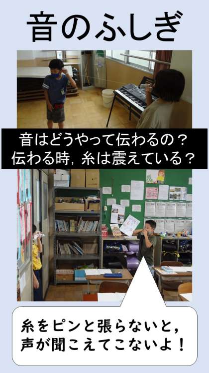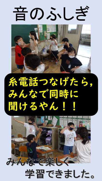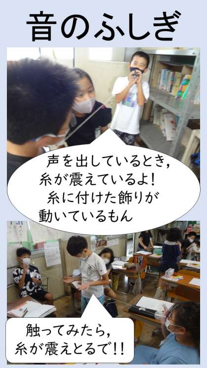 「音のふしぎ」の学習で,糸電話を使って音が伝わる時の様子について確かめました。