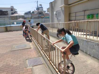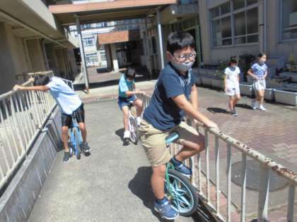 なかよし学級のみんなは今,休み時間に一輪車の練習をすることに夢中です。初めは怖くて難しかった友達も少しずつ練習をしていくことで,サドルにお尻をのせて手すりをつかんで前に進んでいくことができるようになってきました。和気あいあいと楽しく休み時間を過ごしています!