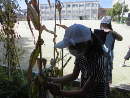 春から育てていたポップコーンになるとうもろこしが実をつけ,収穫をしました。普通のとうもろこしより実は硬くて,きらきらと光っています。なかよしのみんなは一人一人収穫して,皮をむきました。丁寧に上手に作業をすることができました。よくはじけるように紐でくくって現在,ほしています。一か月ほど干せばポップコーンにすることができます。ポップコーンパーティーができることを楽しみしています!