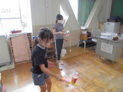 先週からオリジナルのけん玉づくりに挑戦していました。今日は玉を粘土で作ったり,カップを棒に付けたりしてけん玉が出来上がりました。はじめはなかなかうまく入らなかったですが,練習をするにつれて少しずつコツをつかんでカップに玉が入るようになり歓声が上がっていました。
