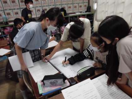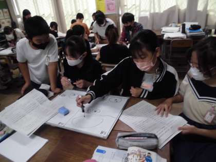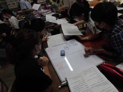 「12月はかにを大きく描かないと」「5月はかわせみ,12月はやまなしをしっかり描こう」などグループで話し合いながら活動を進めていました。