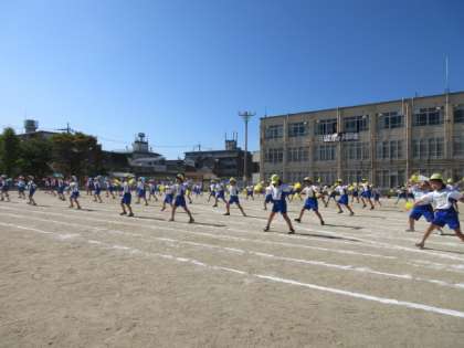 開会式では,一年生の元気いっぱいの開会宣言がありました。その後,黒田先生に続いて児童会で決まったスローガン「進撃の川岡東(かわひが)〜!!」をみんなで言い,気持ちを高めました。