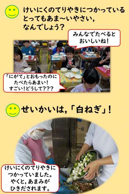 「白ねぎが苦手と思ったけど,食べてみたらあまくておいしかった!」,「鶏肉がやわらかかった!」「週に1回出してほしい!」と大好評でした。