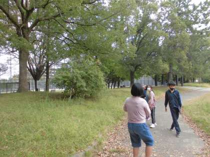 生活単元学習で牛ケ瀬公園に秋見つけに行きました。大きな松ぼっくりに驚いたり,猫じゃらしで友達とじゃれ合ったりしながらいろいろな秋を楽しく見つけました。夏にあったアジサイの花がないことや葉の色が変化していること,虫の声が聞こえること,秋の空がきれいなことなどたくさん秋を見つけて写真におさめることができました。
