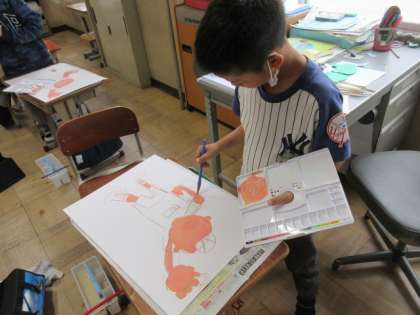 運動会で踊った「ハローきらめきショータイム」。その中で,一番のお気に入りのポーズを描きました。これまでは,パスで人物を描いていましたが,今日は初めて絵の具を混色して色を塗りました。