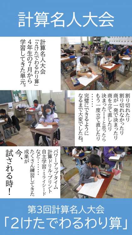 第3回計算名人大会がありました。4年生の7月から学習してきた単元「2けたでわるわり算」。結果は如何に!?