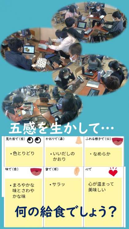 お互いが感じた五感を発表し,何の給食献立かを考えました。