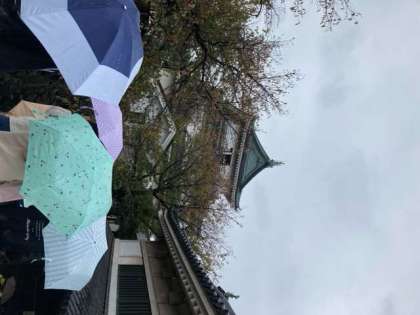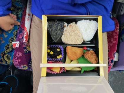 道中,子どもたちから「先生,お昼ご飯まだ〜?」,「おなか減った〜」の声がたくさんあがったことでしょう。担任もこう返したはずです,「まだです!」と。そんな修学旅行ならではのやりとりが何度か繰り返された後,遂にやってきました昼食タイム。お弁当はこんな感じです。三角のおにぎりがおいしそうですね。雨なのでバスの中で食べています。でも,雨はそれほどきつくないそうです。「晩御飯まだ〜?」の声があと数時間後には聞こえてきそうですが,大丈夫,もうすぐみかん食べ放題だぞ!