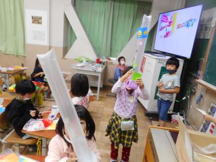 飛び出す動きを利用した面白い,アイディアあふれる作品ができあがりました。