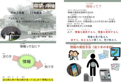 内容については,すでにHPにあげてくれていますが,情報について話をしました。情報機器の発達により,様々な情報を受け取ることが簡単にできるようになり,また,簡単に多くの人に発信することができる便利な社会となっています。しかも,GIGAスクール構想として,一人1台の端末を今,学校で与えています。ますます身近に様々な情報を手にしたり,ちょっとした情報もより多くの人に発信できたりする社会に,子どもたちが置かれているということの自覚を持ってほしい。また,簡単に様々な情報を手することができるからこそ,しっかりと判断する力をもってほしい。そして,情報は送り手も受け手も,人が関わっていることをしっかりと自覚して接してほしいということを考え,子どもたちに話をしました。 また,一度発した情報は消えることがないことやより多くの人に伝わることなどの自覚をもって,情報を発信する姿勢や情報機器の扱いを考えてほしいということも含みながら話しました。