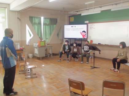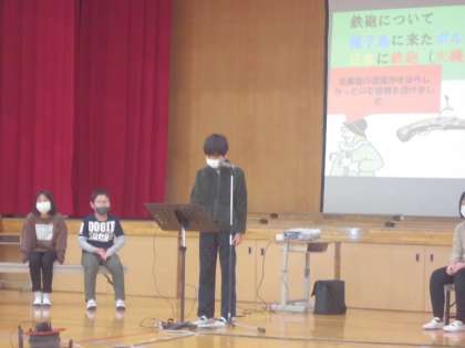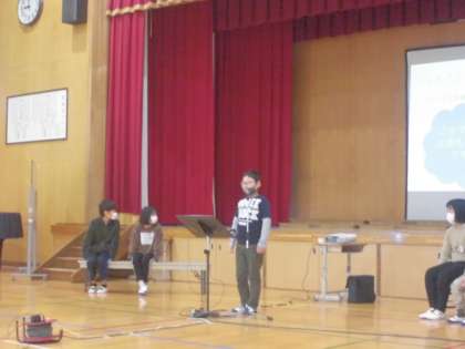 今日の一時間目の児童朝会はなかよし学級のいきいき発表会でした。社会科の学習で日本各地の様子や歴史について調べたことを発表しました。聞き手の6年生を前にして少し緊張気味のなかよしのみんなでしたが,音楽が始まると大きな声で元気よく「すごいぞ日本」の歌とダンスを踊ることができました。発表でも大きな声ではきはきと話したり,相手を意識して落ち着いて発表したりと練習の成果をしっかりと出し切ることができました。6年生も真剣に聞いてくれてふりかえりでは「拍手をしてくれてうれしかった。緊張したけど大きい声で言えた。自分が伝えたかったことがよく伝わるようにはっきり話した。」など自信をもってできたことにとても喜んでいました。校長先生も教室に来てくださり,よかったところを伝えてくださいました。とても嬉しそうでした。素晴らしかったです。