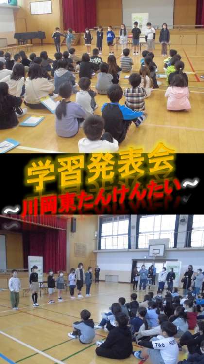 「川岡東たんけんたい」と題して,総合的な学習の時間で学んだことの途中経過を発表しました。