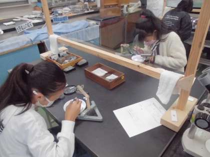 実験では,物理「バランスの科学」と地学「石の中からキラキラゲット」に分かれて学習を進めていきました。