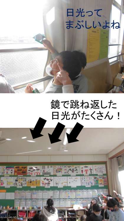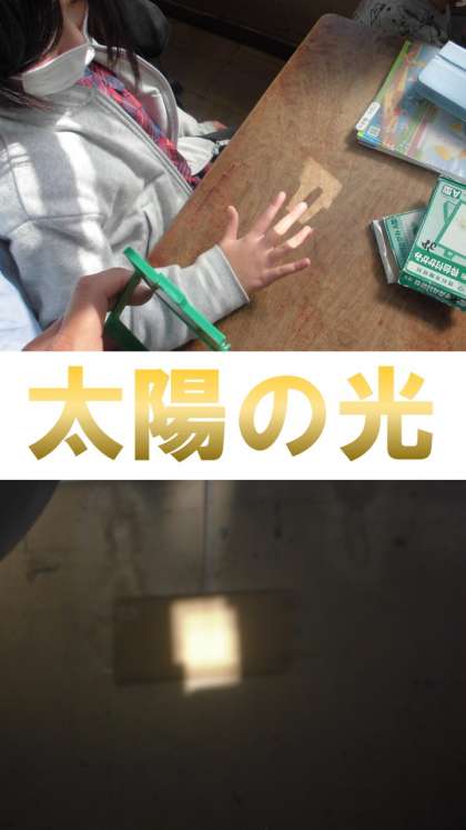鏡を使って太陽の光を跳ね返したり,光を集めたりすることによって明るさや温かさはどのように変わるのかを実験しました。