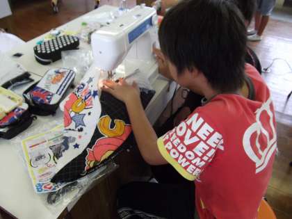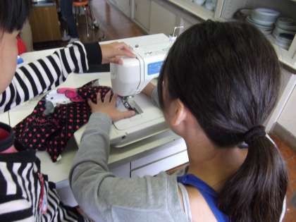 最初,ミシンを使うことに慣れずに困っていた子どもたち。