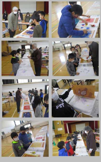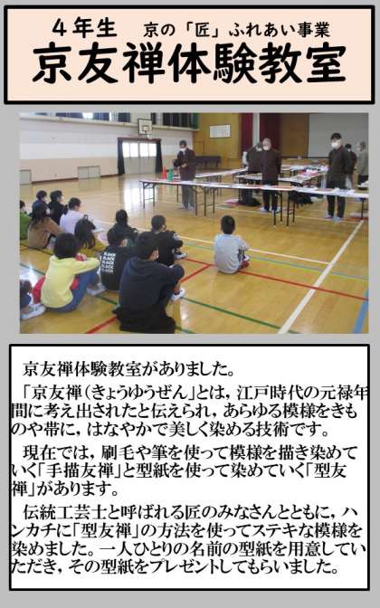 京友禅体験教室がありました。伝統工芸士と呼ばれる匠のみなさんとともに,ハンカチに「型友禅」の方法を使ってステキな模様を染めました。一人ひとりの名前の型紙を用意していただき,その型紙をプレゼントしてもらいました。