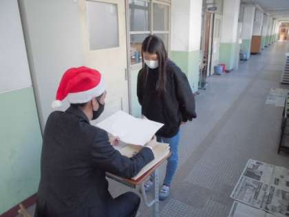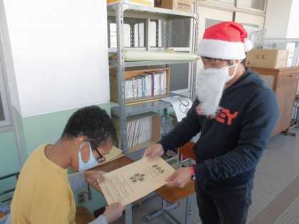クリスマスイブに先生から渡された通知票。先生からのクリスマスプレゼントに,子ども達の顔も笑顔になっていました。今回渡された通知票は4月から今までの子ども達のがんばりを表したものです。