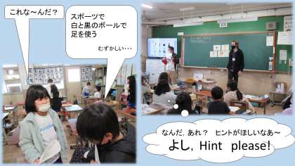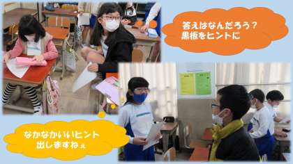 外国語では,ヒントを出しながら答えを考えるクイズを行っています。