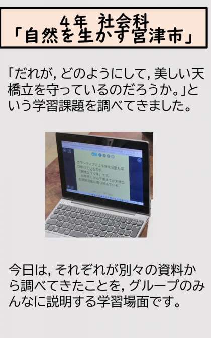 4年の社会科で,京都府内の特色ある地域の学習で「自然を生かす宮津市」という単元の学習をしています。「だれが,どのようにして,美しい天橋立を守っているのだろうか。」という学習課題でそれぞれが調べてきたことを,グループで交流する場面です。それぞれが別々の資料で調べてきたことを,相手に上手く伝わるように交流しようとしています。調べるときにも,相手に伝わるように,難しい言葉は調べたり,わかりにくい言葉は資料を用意したりすることを大切にしてきました。聞く側も,わからないことを積極的に質問する姿がありました。問題解決のために,「自分で頑張る」「みんなで協力する」とても大切な力です。