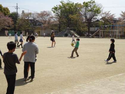 夏を思わせるような暑い日差しの中,さっそく運動場で遊んでいる子ども達が大勢いました。新しい先生や友達と遊んで,楽しそうですね。