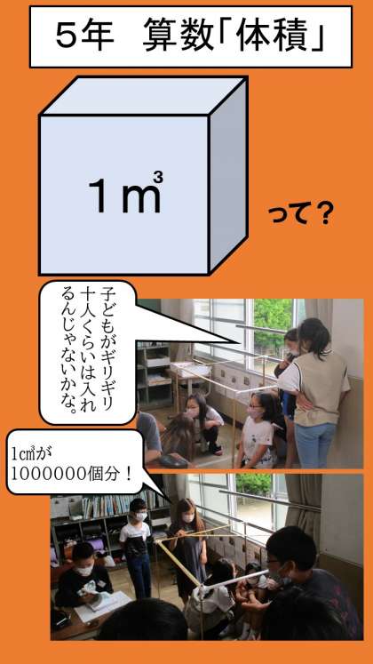 今回は,直方体,立方体の1辺の長さの単位がm(メートル)の場合です。「教室は何立方メートルあるのかな?」そして,「何立方センチメートルあるのかな?」そんなイメージを広げる5年生なのでした。