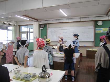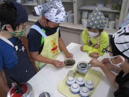 使い慣れない道具に少し緊張気味の子どもたち。お茶を入れる順序に気をつけながら,頑張って取り組んでいました。
