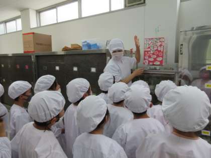 生活科「なかよしいっぱい だいさくせん」で,給食室の探検に行きました。調理員さんがどんなふうに給食を作っておられるのか聞かせていただいたり,鍋や調理道具などを見せてもらったりしました。もやしはザルごと鍋のお湯につけて茹でる様子をみてみんなびっくり。「もやしのにおいがするね。」と話していました。見学した後は,見つけたよカードに見学したことを書きました。