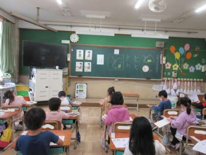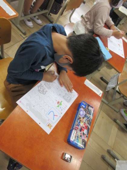 ひらがなの学習をがんばっています。マス目に区切られた4つの部屋を意識して,とめ・はね・はらいまで注意深く丁寧に書く姿が見られます。言葉集めも楽しく取り組んでいるみんな。