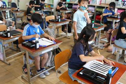 3年生で書道セットを使って,習字の学習が始まりました。