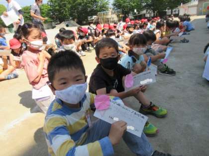18日(水)の5時間目,2年生が集会を開いてくれました。最初に,2年生が作成した学校の教室ポスターを紹介してもらいました。次に,一人一人にあさがおの種のプレゼントをもらいました。朝顔の折り紙に入った種と,メッセージカードです。もらうときには,自己紹介をして,少し仲良くなれました。とっても嬉しそうな1年生。2年生のみんな,ありがとうございました。