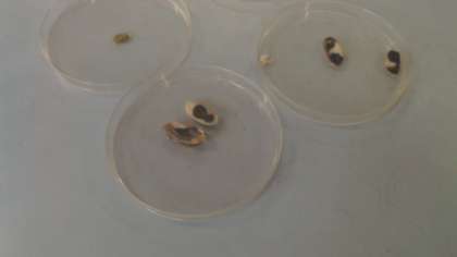 今回は理科室で実験をしました。インゲンマメを半分に切り,