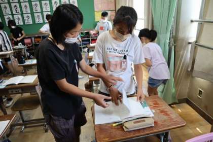 などの自主学習ノートを見つけたら,自分の名前を書いたシールをペタッ。