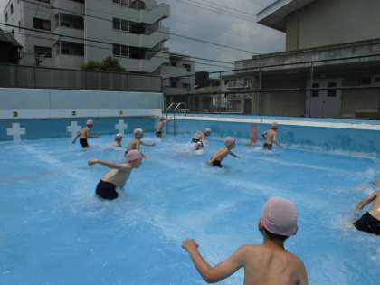 しっかり準備体操から行い,水の中を歩いたり,友達と水をかけあったりと,1年生のみんなは水泳学習を楽しんでいるようでした。