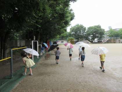 今日の5時間目,雨が降っていたので,みんなで傘を差して雨の日たんけんに行きました。