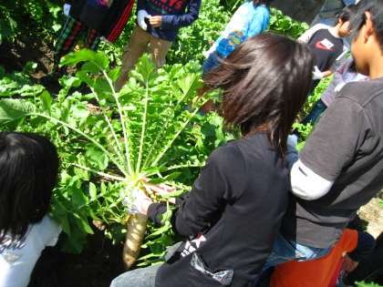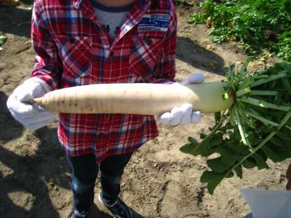 農家の方のご好意で,一人1本ずつ大根を抜き,おみやげとしていただきました。子どもたちは,土と大根のにおいを直に感じ,またその大きさにも感動していました。とても貴重な体験をさせていただきました。本当にありがとうございました。