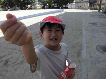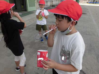 夏の暑さがまだ残っているので、生活科「なつだとびだそう」の単元でシャボン玉をするために飛び出しました!