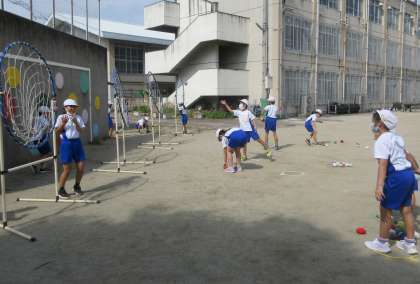 マット運動では、意欲的に練習する姿が見られました。「きれいに回る」ことが目標です。体を丸くして回れるように何度も練習していました。