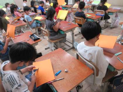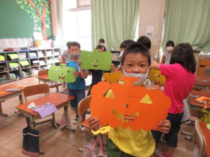 図画工作科でハロウィン飾りを作っています。思い思いのかぼちゃの表情を描いてはさみで切ると、この通り!かわいいかぼちゃができました。黒い画用紙に貼って、周りを飾りづけしていきます。おばけに魔女にお菓子に・・・楽しい飾りを作っています。
