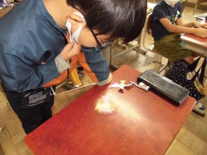 「ふきこま」に点をかいて回してみると、その点が〇に見えることにも気づき、次の円を描く学習にもつなげることができました。