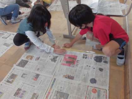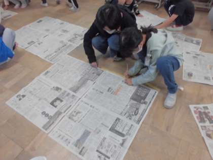 1平方メートルの大きさを実感するために、新聞紙で縦横1mの正方形を作りました