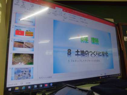 理科の授業は『土地のつくりと変化』という、この単元から中野先生にお世話になります。所先生から中野先生へとバトンタッチされても、変わらず真剣に授業に取り組みます。早速、たくさんのスライドを用意していただき、それをもとに子どもたちは予想を立てていました。